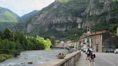 Entschluss die Bergetappe wegzulassen und gleich an der Brenta Richtung Bassano del Grappa zu fahren. Bei Sonnenschein und leichter Tour kann Frau leider nicht richtig schalten und Bowdenzug gelöst und schalten nicht mehr möglich, leider auch erste Hilfe misslungen. Weiterfahrt mit falschem Gang aber immer an der Brenta entlang. Durch spektakuläre Schluchten mit erneutem Versuch einer Reperatur bis an das kleine Örtchen Valstagna.